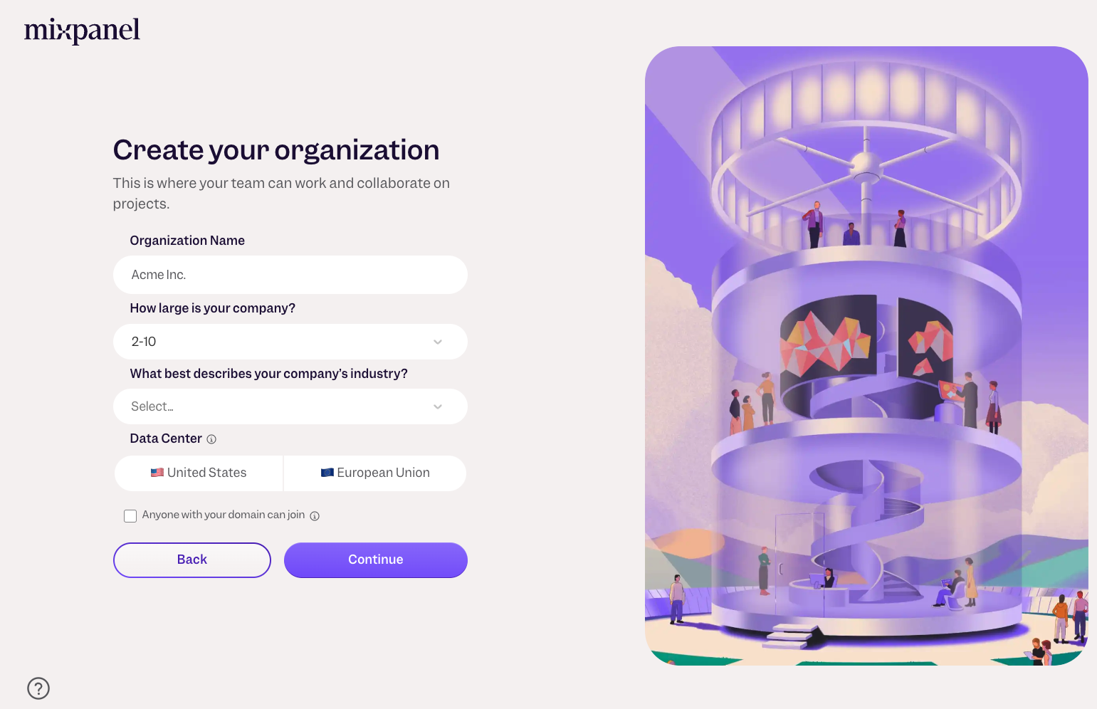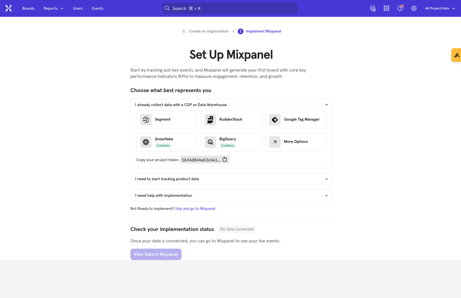 After creating your organization, you'll encounter a setup screen. Here, you're just a few clicks away from integrating Mixpanel into your product.