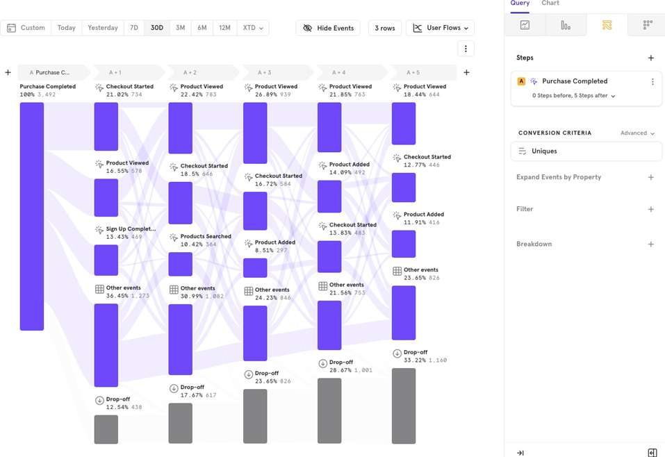 Use User Flows to see the steps users take after completing an event, such as after making a purchase.