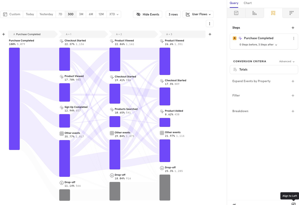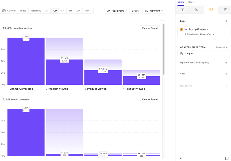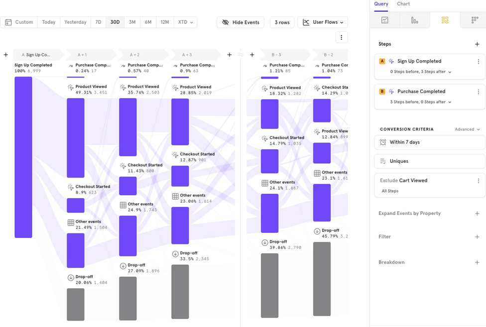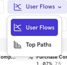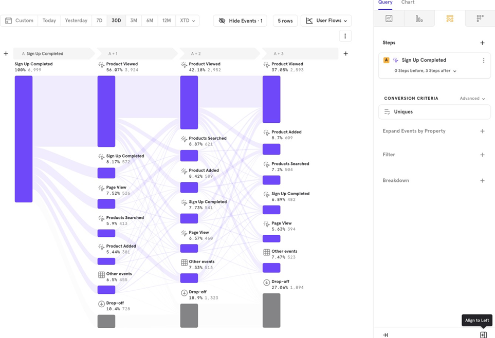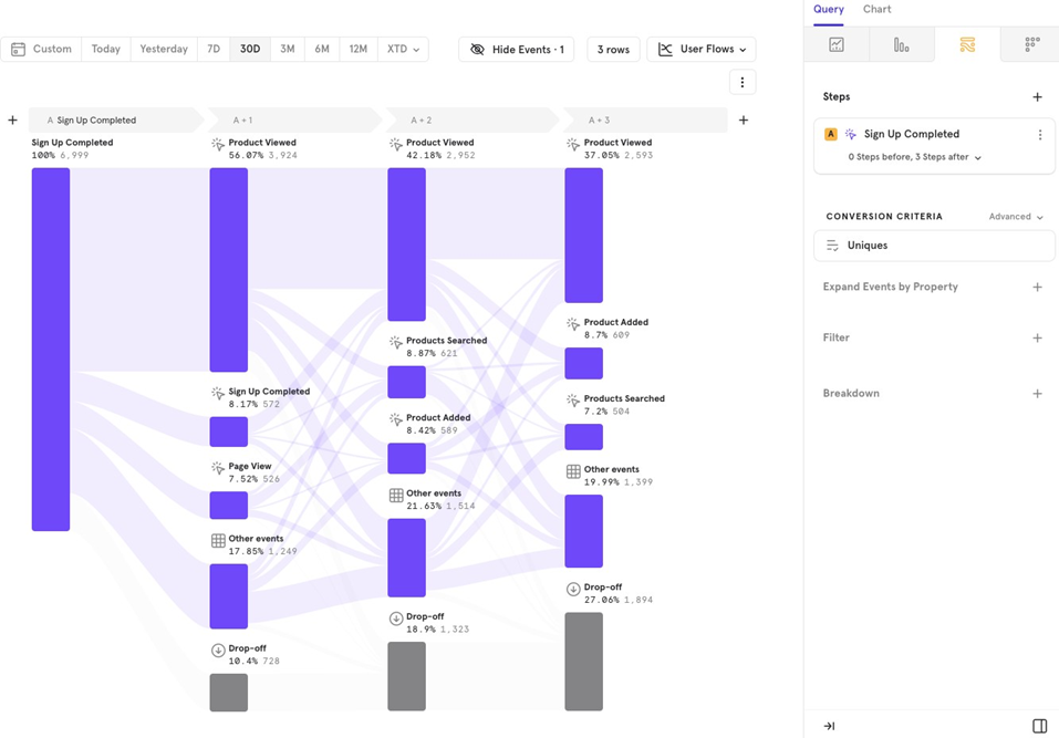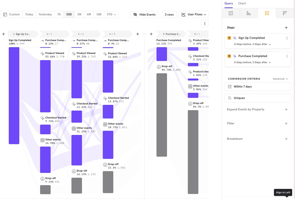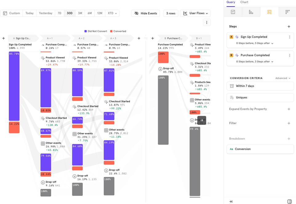 This feature helps you analyze flows by comparing users who converted versus those who didnʼt. For example, you can track the flow from Sign Up to Purchase Completed for both converted and non-converted users.