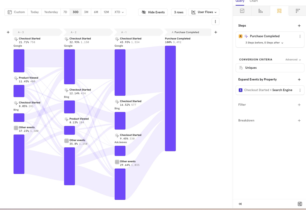 Example You want to see the steps before a purchase and break down Checkout Started by the search engine to understand which search engine drives the most conversions.