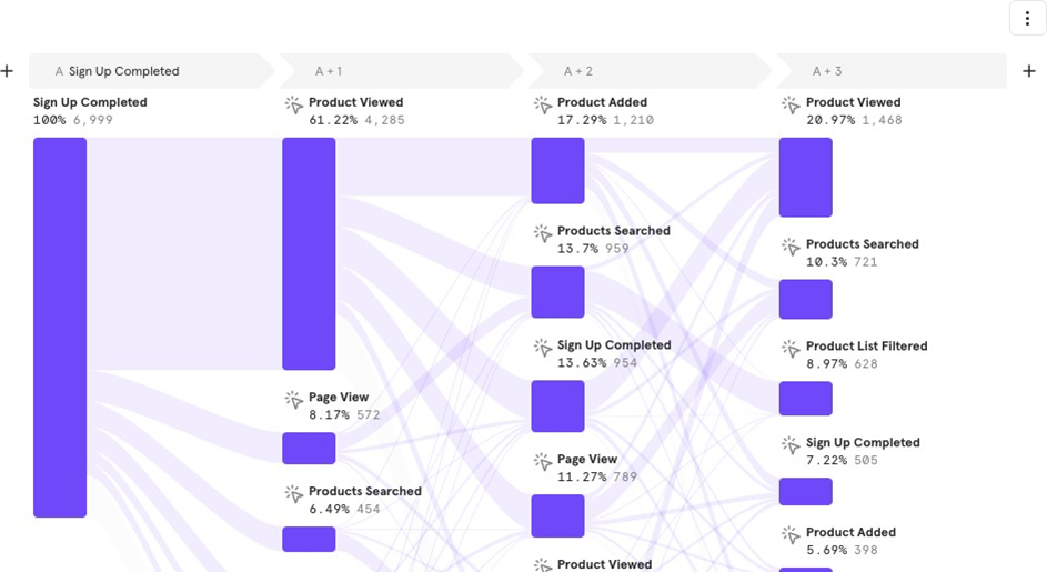 Example: You want to track users who completed Sign up, see their next 3 steps, and then understand how these users reach the Purchase Completed event. This helps identify steps users are likely to take to complete a purchase.