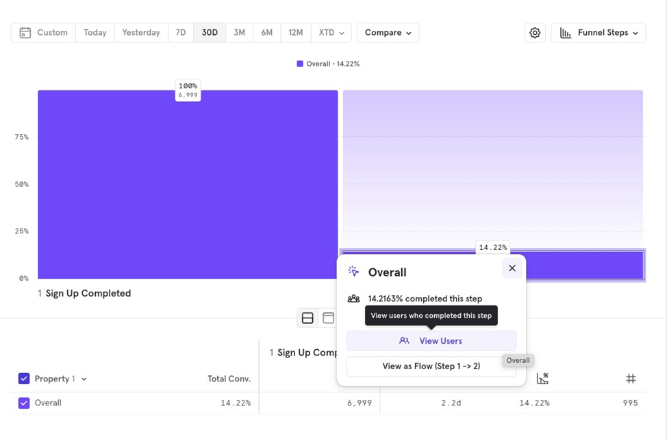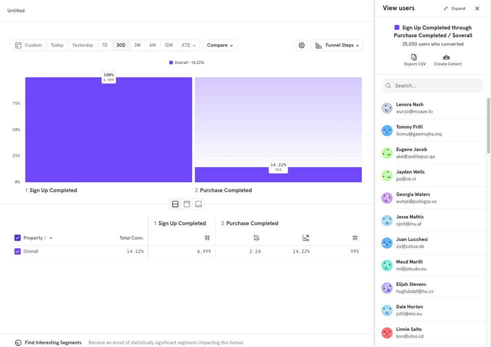 For example, if you create a funnel chart for Sign Up to Purchase Completed over the last 30 days, May 20 to June 20, the cohort will capture users from this period.
