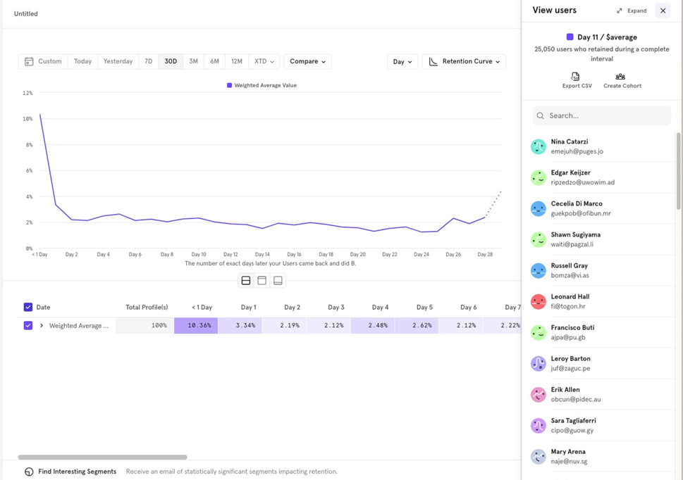 To create a cohort: Click on the Day 10 pointer Choose between Retained or Dropped Off users → Create Cohort.