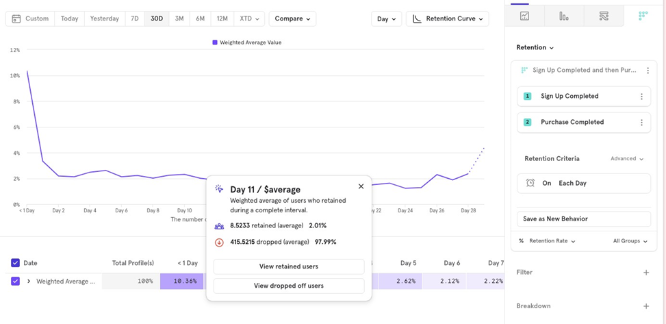 However, because of the dynamic nature, if your conversion criteria allow 7 days for purchase completion after signup, users who signed up yesterday still have 6 days to be counted as converted or not. The cohort will update as users complete or drop off.