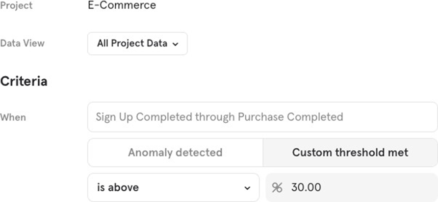 This alert triggers when a specific number or percentage is met or crossed. For example, you want to set an alert for the percentage of sign-ups to purchases completed.