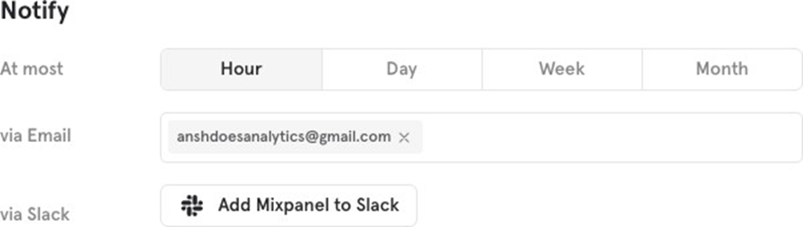 - If the frequency is set to hourly, Mixpanel will check every hour if the alert condition is met.