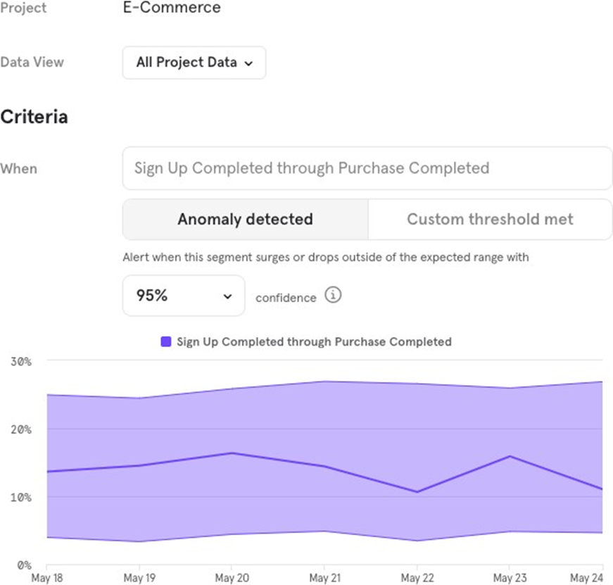Example: You want to be alerted when the percentage of sign-ups to purchases goes beyond the expected range. By choosing a 95% confidence interval, Mixpanel calculates the boundaries, and if the conversion rate falls outside the purple range, an alert is triggered.