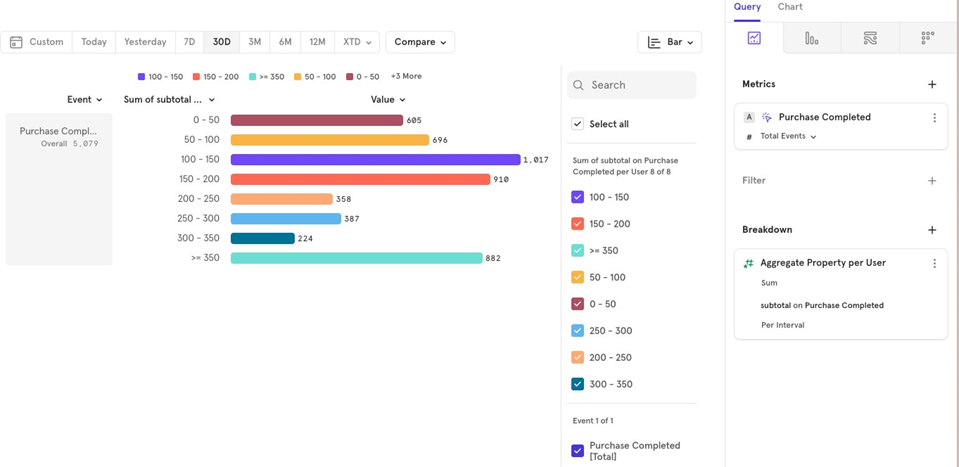Youʼre analyzing Purchase Completed events in the last 30 days and want to break them down based on the total purchase value (sum of subtotal) per user. This can help you understand how many users made purchases with a total value greater than 300, less than 300, and so on.