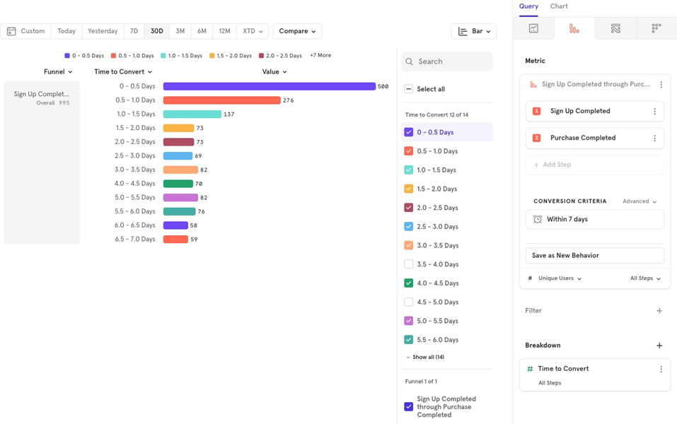 You want to see how long it takes for users to go from Sign Up to Purchase Completed. Using the Time to Convert property, you can visualize the time distribution for those who successfully converted.