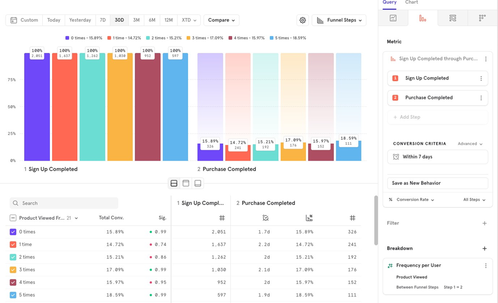 In this case, you can break down the Sign Up to Purchase Completed funnel by choosing Frequency per user and selecting Product Viewed as the event.