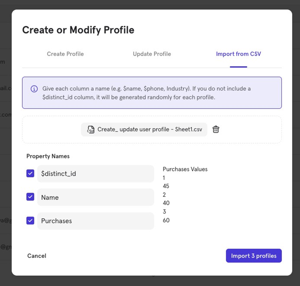 You can create or update multiple user profiles by uploading a CSV file. The file must include a column with distinct_id for Mixpanel to recognize the users.