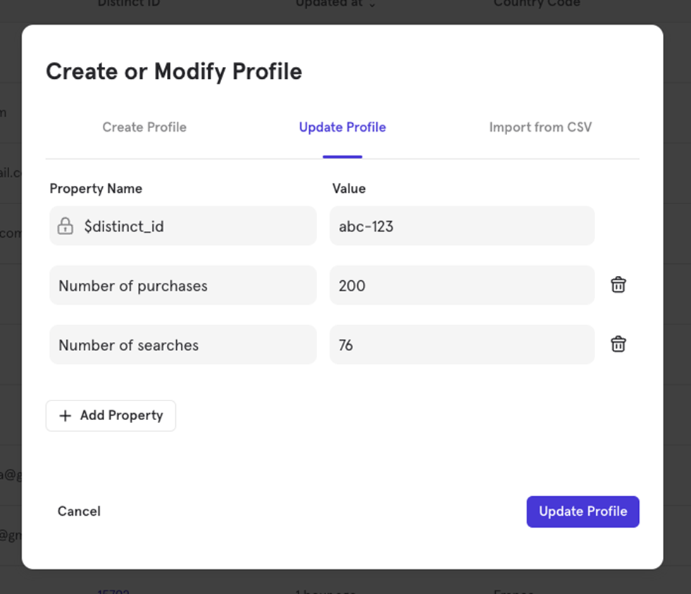 Updating a profile is similar to creating one. You can add new properties or update existing ones. For example, if a user profile has number of purchases as 100, you can update it to 200 and add a new property like number of searches.