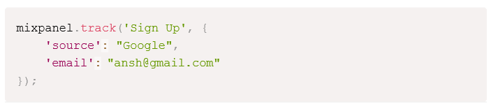 To track an event along with properties, embed the tracking code in the function that triggers the event. For example, to track a user sign-up:
